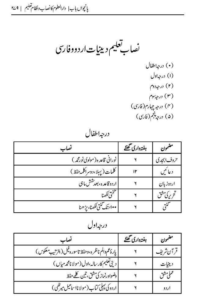 (۱) بدایة الخو مکمل۔ (۲) علم الصیغہ تا افادات نافعہ ص ۷۴ بعد فصول اکبری خاصیات مکمل ۔ (۳) نور الایضاح مکمل بعده قدوری از ابتداء تا کتاب الحج مکمل۔ (۴) القراءة الواضحہ دوم و نفحۃ الادب مکمل۔ (۵) آسان منطق مکمل بعده مرقات تا فصل في الأغاليط۔ ( ۶ ) جمال القرآن مع مشق پارہ عم شروع کے تین ربع ۔